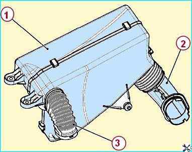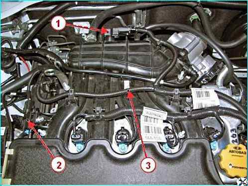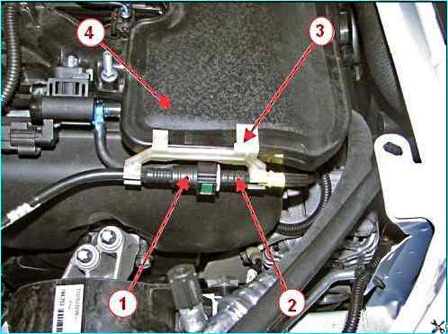 Присоединить резонатор 1, рисунок 3, впуска к корпусу воздушного фильтра и воздухозаборнику и закрепить к кузову двумя болтами.