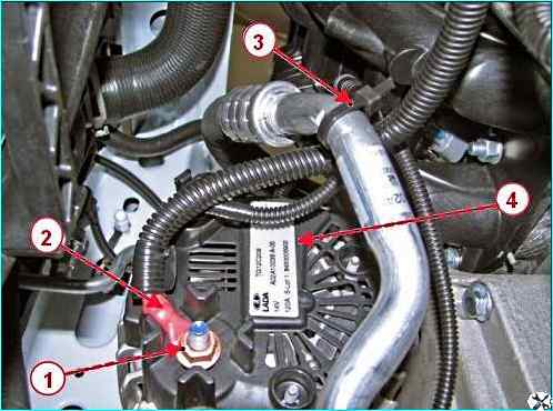 - - головкой на 13 отворачиваем гайку 1, рисунок 18, крепления и отсоединяем от генератора 4 клемму 2 жгута проводов переднего;