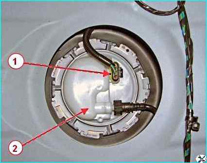 Присоединяем разъем 1, рисунок 2, жгута проводов заднего к бензонасосу 2, устанавливаем крышку 1, рисунок 1, люка бензонасоса и опускаем подушку заднего сиденья.