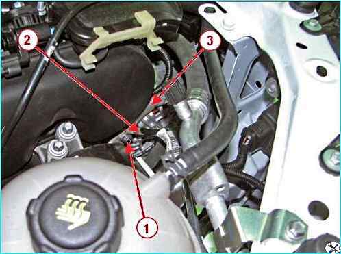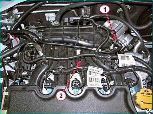 Отсоединяем наконечник 1, рисунок 5, трубки клапана адсорбера и саму трубку от модуля 2 впуска.