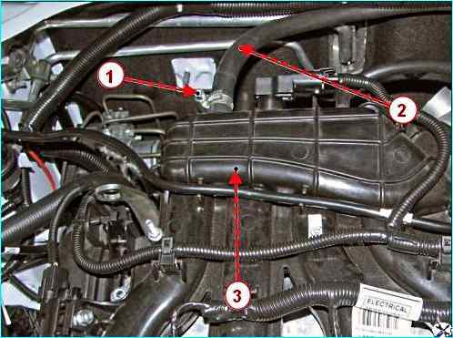 Крестовой отверткой ослабляем хомут 1, рисунок 21, крепления и отсоединяем шланг 2 вакуумного усилителя тормозов от модуля 3 впуска.