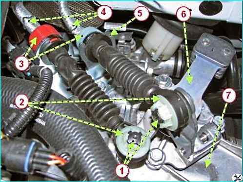 Отводим фиксаторы 3 вдоль оси тросов 4 в направлении от кронштейна 5 и выводим тросы из пазов кронштейна на коробке 7 передач.