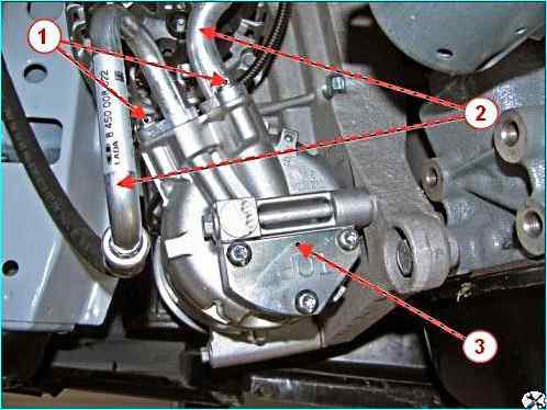 Головкой на 8 откручиваем два болта 1, рисунок 23, крепления трубопроводов 2 к компрессору 3 системы кондиционирования воздуха и отсоединяем трубопроводы.