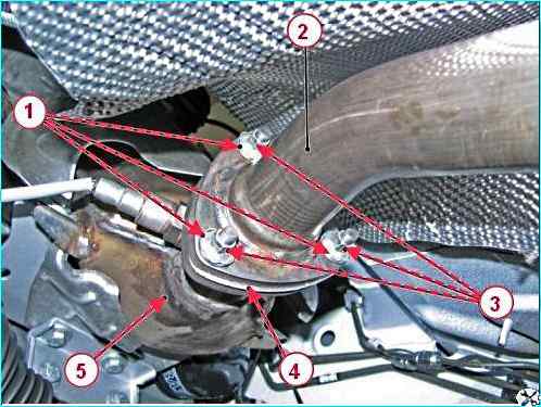 С помощью отвертки расконтриваем три шайбы 1, рисунок 24, контрящие и головкой на 10 отворачиваем три гайки 3 шпилек крепления дополнительного глушителя 2 к приемной трубе 5 глушителя с нейтрализатором в сборе