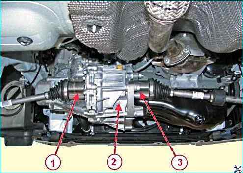 Выбиваем и выводим внутренние шарниры приводов 1 и 3, рисунок 27, передних колес из шестерен полуосей дифференциала коробки 2 передач и устанавливаем на их место транспортные заглушки.