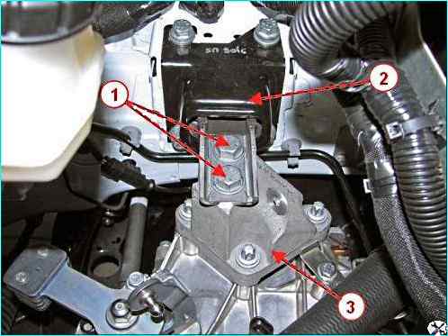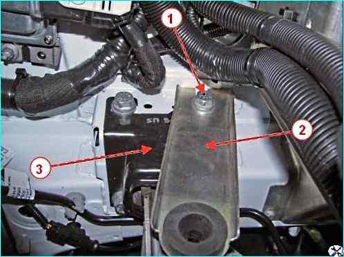 Головкой на 16 ослабляем болт 1, рисунок 30, крепления кронштейна 2 воздушного фильтра и снимаем кронштейн с левой опоры 3 подвески силового агрегата.