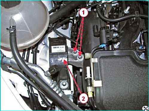 Головкой Torx E12 откручиваем и извлекаем два болта 1, рисунок 32, крепления силового агрегата к правой опоре 2 подвески силового агрегата.