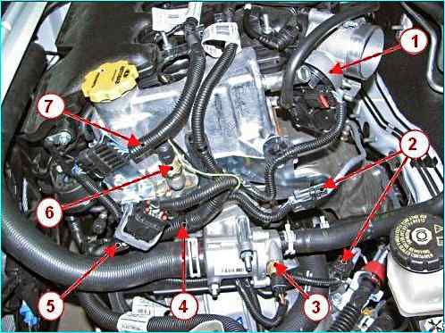 Плоскогубцами отжимаем хомут 1, рисунок 4, крепления и отсоединяем верхний шланг 3 вентиляции картера от патрубка крышки 7 головки цилиндров.