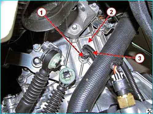 Головкой на 17 отворачиваем гайку 1, рисунок 19, крепления клеммы 2 провода "массы" от шпильки на коробке 3 передач и отсоединяем клемму;