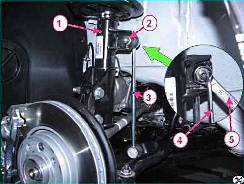 Отсоединение стойки стабилизатора от стойки передней подвески: 1 - стойка передней подвески; 2 - гайка крепления стойки стабилизатора; 3 - стойка стабилизатора; 4 - ключ шестигранный; 5 - ключ кольцевой на 16