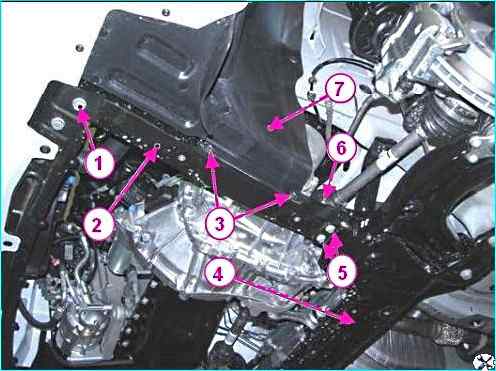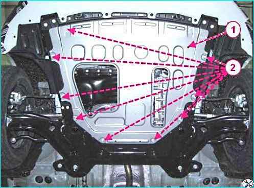 Снятие брызговика двигателя: 1 - брызговик двигателя; 2 - болт крепления брызговика