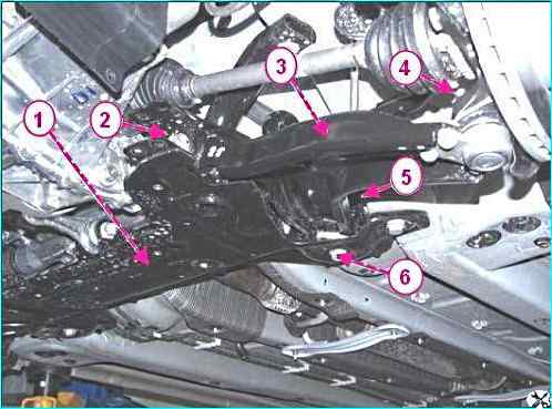 Снятие рычага нижнего передней подвески: 1 - подрамник передней подвески; 2 - болт крепления переднего шарнира рычага; 3 - рычаг нижний передней подвески; 4 - гайка крепления шаровой опоры к поворотному кулаку; 5 - гайка крепления заднего шарнира рычага; 6 - болт крепления заднего шарнира рычага