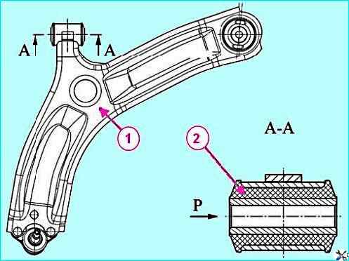 Замена переднего шарнира рычага передней подвески: 1 - рычаг нижний передней подвески; 2 - шарнир нижнего рычага передний; Р - направление запрессовки
