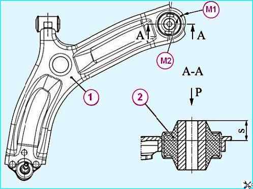 Замена заднего шарнира рычага передней подвески: 1 - рычаг нижний передней подвески; 2 - шарнир нижнего рычага задний; S - размер для запрессовки – 20 мм; Р - направление запрессовки; М1 - метка на рычаге передней подвески; М2 - метка на корпусе шарнира