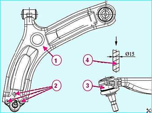 Установить рычаг 1, рисунок 7, передней подвески на сверлильный станок, высверлить головки заклепок 2 со стороны шаровой опоры 3 сверлом Ø15 мм и выбить заклепки из рычага передней подвески.