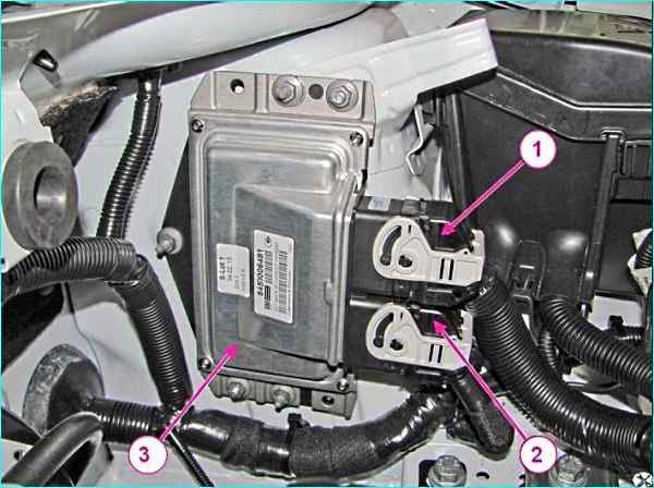 Контроллер ЭСУД: 1 - разъем жгута проводов системы зажигания; 2 - разъем жгута проводов переднего; 3 - контроллер ЭСУД