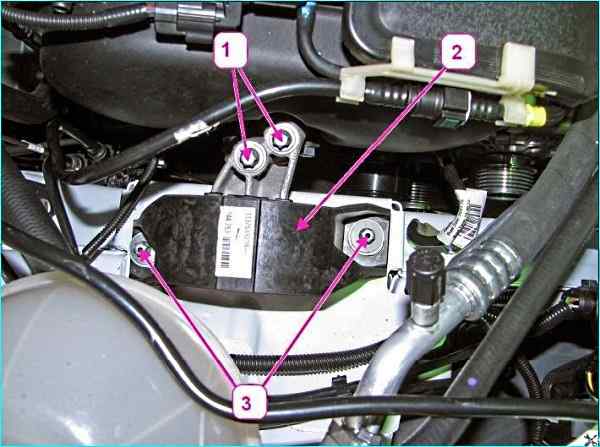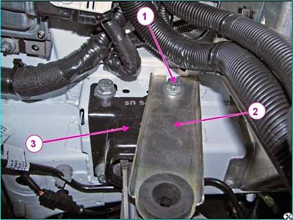 Кронштейн воздушного фильтра: 1 - болт; 2 – кронштейн воздушного фильтра; 3 - левая опора подвески силового агрегата