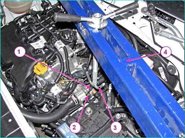 Установить на автомобиль траверсу 4 для вывешивания силового агрегата, завести крюк 3 траверсы в проушину технологического рыма с левой стороны двигателя и вывесить силовой агрегат.