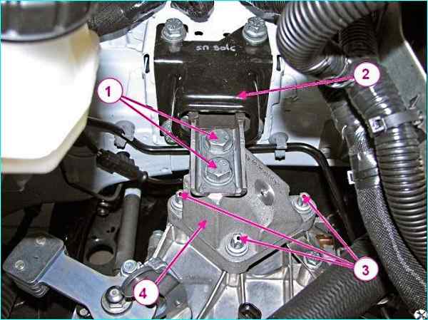 Крепление левой опоры подвески силового агрегата к коробке передач: 1 – болт крепления силового агрегата к левой опоре; 2 левая опора подвески силового агрегата; 3 - болт крепления кронштейна к коробке передач; 4 - кронштейн