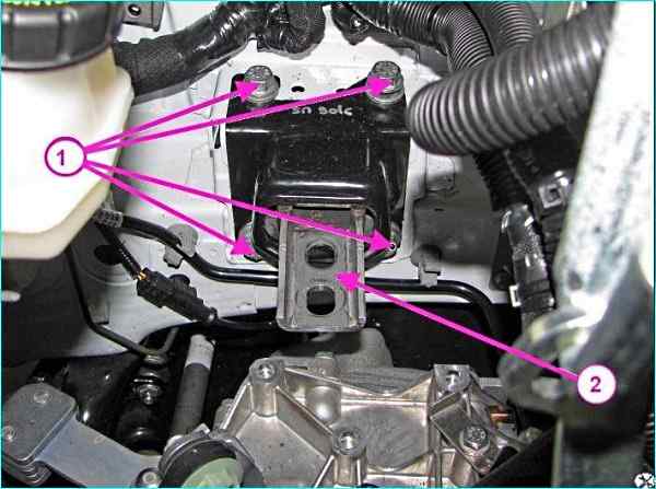 Крепление левой опоры подвески силового агрегата к кузову: 1 - болт крепления левой опоры подвески силового агрегата к кузову; 2 - левая опора подвески силового агрегата