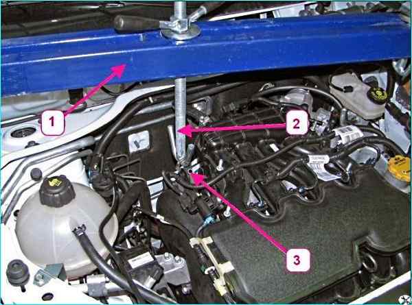 Вывешивание силового агрегата: 1 - траверса для вывешивания силового агрегата; 2 - крюк траверсы; 3 - рым двигателя