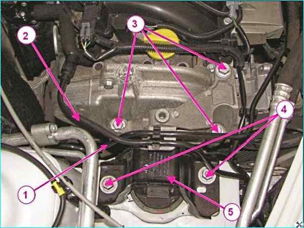 Правая опора подвески силового агрегата HR16: 1 – трубка топливная; 2 – трубка системы улавливания паров бензина; 3 - болт крепления кронштейна правой опоры подвески к двигателю; 4 - болт крепления правой опоры подвески силового агрегата к кузову; 5 – правая опора подвески силового агрегата