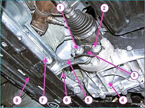 Задняя опора подвески силового агрегата: 1 - болт крепления штанги задней подвески силового агрегата; 2 – болт крепления кронштейна; 3 - кронштейн; 4 - коробка передач; 5 – штанга задней подвески силового агрегата; 6 – гайка; 7 – болт крепления штанги задней опоры подвески силового агрегата к подрамнику; 8 - подрамник передней подвески