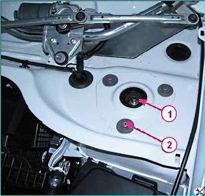 Снятие стойки передней подвески: 1 - опора верхняя стойки передней подвески; 2 – болт крепления верхней опоры стойки подвески