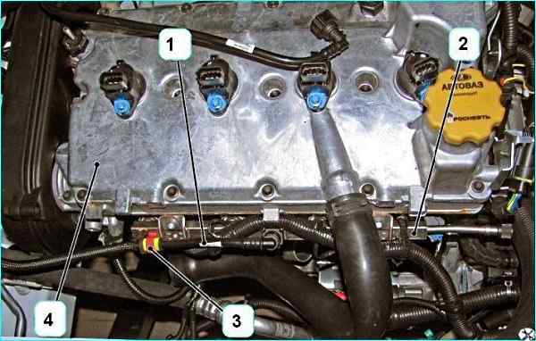 Присоединить колодки жгута 1, рисунок 4, проводов к топливным форсункам 2 и закрепить жгут двумя новыми хомутами 3 к рампе форсунок (для автомобилей с двигателем 21129).