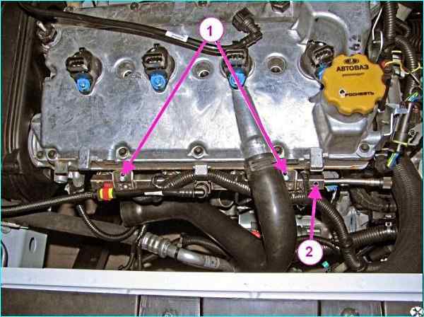 Установить рампу 2 с форсунками в сборе на двигатель.