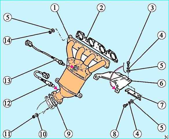 Приемная труба глушителя с нейтрализатором в сборе: 1 - труба приемная глушителя с нейтрализатором в сборе; 2 - прокладка газопровода; 3 - болт М8х18; 4 - шайба 8 пружинная; 5 – шайба 8; 6 – кронштейн приемной трубы; 7 – опора кронштейна приемной трубы; 8 – болт М8х16; 9 – прокладка фланца глушителя; 10 - шайба контрящая; 11 - гайка крепления глушителя; 12 - диагностический датчик концентрации кислорода; 13 - управляющий датчик концентрации кислорода; 14 - гайка М8