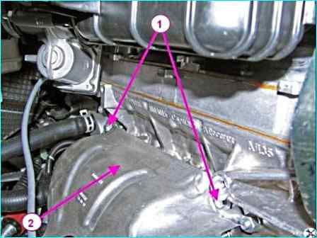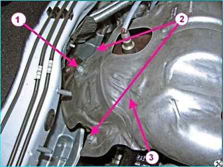 Установить термозащитный экран приемной трубы глушителя с нейтрализатором в сборе и закрепить болтами 1 и 2, рисунок 3, болтами 1, рисунок 4, крепления с шайбами.