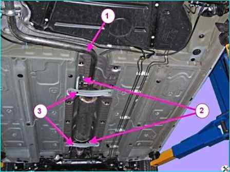 Установить глушитель 3 дополнительный с помощью кронштейнов 2 подвески глушителя на шпильки крепления на кузове и закрепить четырьмя гайками 1.