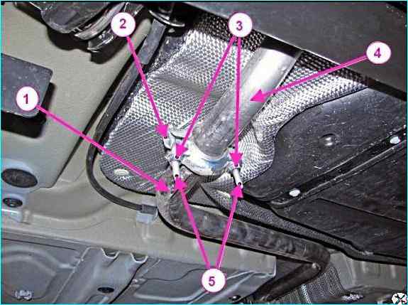 Расконтрить шайбы 1, рисунок 2, и отвернуть три гайки 3, шпилек крепления дополнительного глушителя 2 к приемной трубе 5 с нейтрализатором в сборе