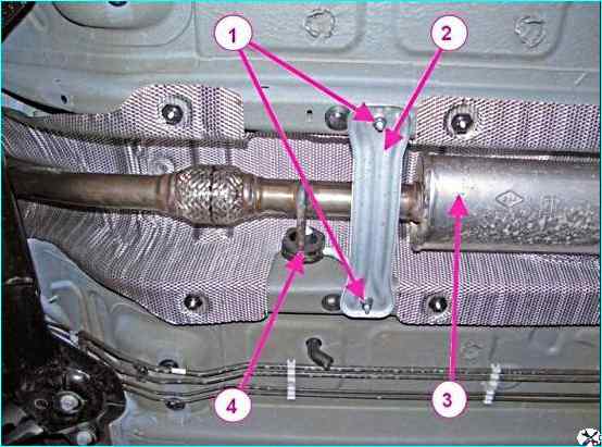 Отвернуть четыре гайки 1, (см. рисунок 7), крепления кронштейнов 2 к кузову и снять дополнительный глушитель 3 с подушками 4 подвески и кронштейнами в сборе.