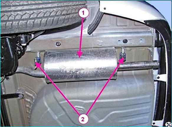 Смазать мыльным раствором и извлечь кронштейны основного глушителя 1, рисунок 8, из отверстий подушек 2 подвески глушителя и снять основной глушитель.