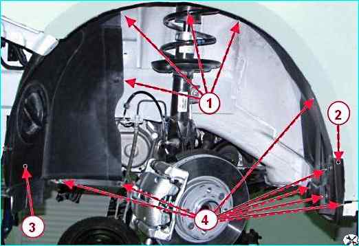Плоской отверткой извлекаем, держатели 1 щитка переднего крыла и снимаем щиток.