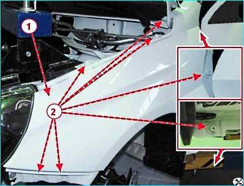 Головкой на 10 отворачиваем семь болтов 2, рисунок 2, крепления переднего крыла 1 к кузову и снимаем крыло.