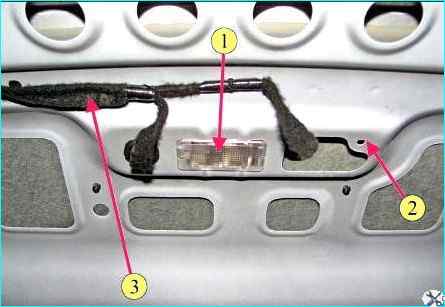 Установка плафона освещения багажника на автомобиле: 1 - плафон освещения багажника; 2 - панель полки задка; 3 - жгут проводов задний дополнительный