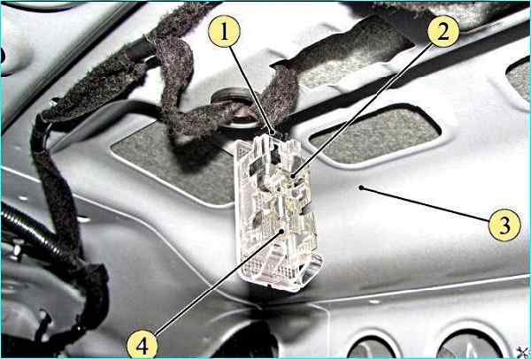 Замена лампы плафона освещения багажника: 1 - колодка жгута проводов заднего дополнительного; 2 - плафон освещения багажника; 3 - панель полки задка; 4 - лампа W5W