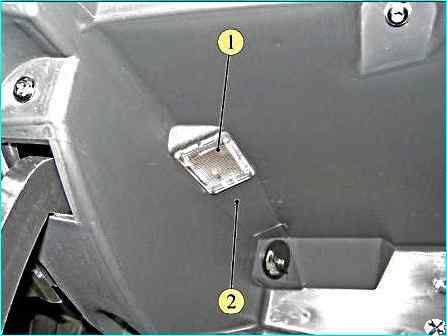 Отсоединяем колодку 1, рисунок 2, жгута проводов заднего дополнительного от разъема и снимаем плафон 2 освещения багажника.