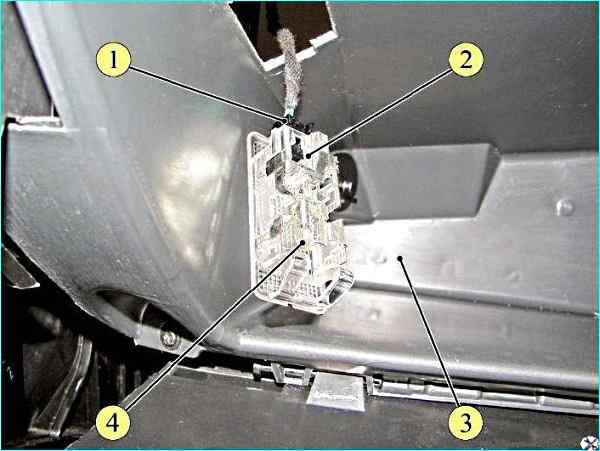 Отсоединяем колодку 1, рисунок 4, жгута проводов панели приборов от разъема и снять плафон 2 освещения вещевого ящика.