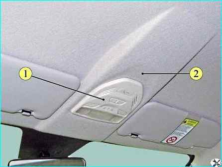 Плафон освещения салона: 1- рамка плафона освещения салона; 2 - обивка крыши