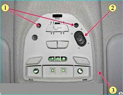 Плафон освещения салона со снятой рамкой: 1 - винт самонарезающий; 2 - плафон освещения салона; 3 - обивка крыши