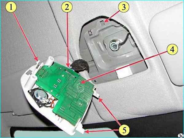 Снятие плафона освещения салона: 1- фиксатор пружинный; 2 - колодка жгута проводов; 3 - гнездо под установку пружинного фиксатора; 4 - плафон освещения салона; 5 - фиксатор