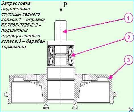 Устанавливаем тормозной барабан 2, рисунок 4, на стол пресса, устанавливаем на подшипник оправку 1 и выпрессовываем подшипник 3 ступицы заднего колеса из тормозного барабана.