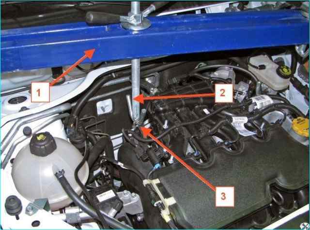 Устанавливаем на автомобиль траверсу 1, рисунок 2, для вывешивания двигателя, заводим крючок 2 траверсы в проушину 3 правого рыма, и вывешиваем силовой агрегат с правой стороны.