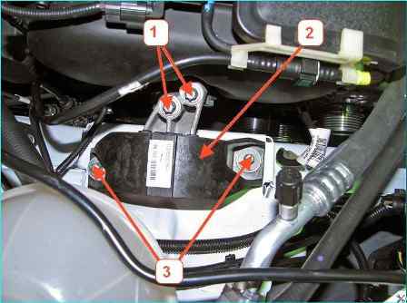 Правая опора подвески силового агрегата: 1 - болт крепления силового агрегата к правой опоре; 2 - правая опора подвески силового агрегата; 3 - болт крепления правой опоры подвески силового агрегата к кузову