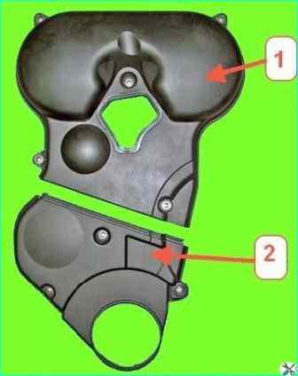 Передние защитные крышки привода ГРМ двигателя 21129: 1 - передняя верхняя защитная крышка привода ГРМ; 2 - передняя нижняя защитная крышка привода ГРМ