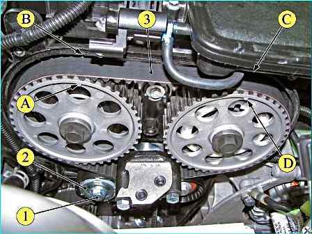 Снятие ремня привода ГРМ на двигателе 21129: 1 - болт крепления автоматического натяжителя; 2 - автоматический натяжитель зубчатого ремня; 3 - ремень зубчатый привода ГРМ; "А", "В", "С", "D" - метки установочные